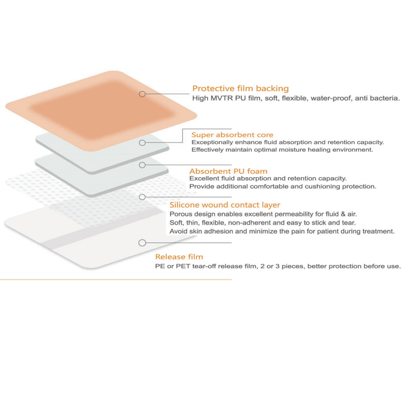 Bordered slicone foam dressing är ett självhäftande förband med en extra kantad kant som består av skyddande flm baksida, superabsorberande kärna, absorberande PU-skum, siikon sårkontaktlager och releasefim.