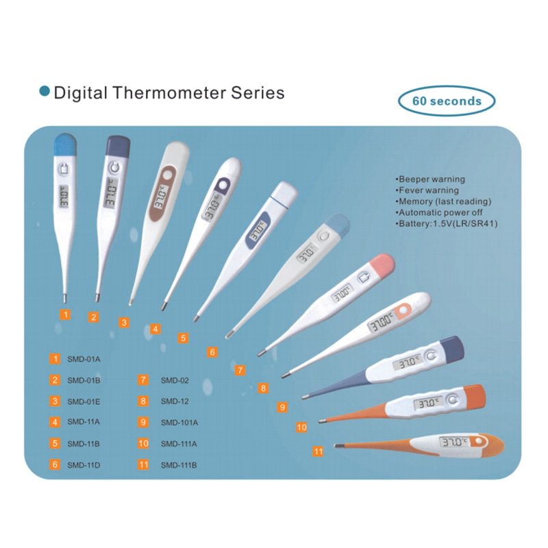 | SMD-01A | 15,5x6,5mm | 127x18x10mm | 10,5 g | 32,0℃–42,0℃ 89,6F-107,6F | ±0,1 ℃ (35,5 ℃ -42,0 ℃)/ ±0,2F(95,9F-107,6"F) ±0,2 ℃ (< 35,5 ℃) ±0,4F (< 95,9F) | 0,1 ℃/ 0,1F | 60 sekunder | ||