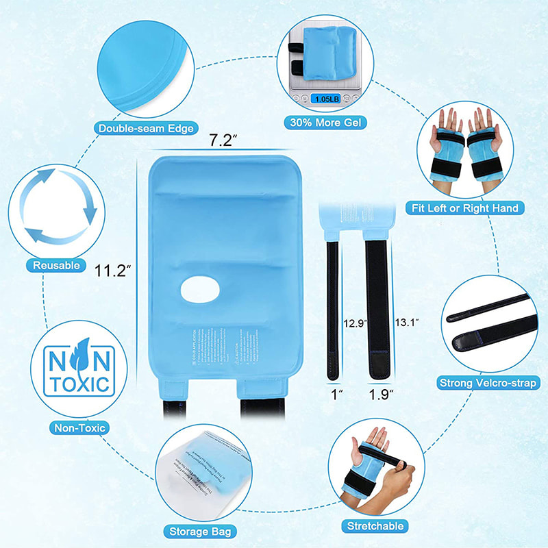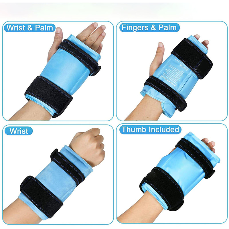 Gör en kall kompression med det elastiska bandet för att omsluta den skadade handleden för att påskynda återhämtningen från karpaltunnelsyndrom och återhämtning efter operation, minska blåmärken och svullnad relaterade till sportskador och lindra kroniska ledsmärtor. Det finns 4 metoder för att använda ispaketet, riktade till fingrar och handled. För att förhindra gelläckage tillämpar handledens isomslag dubbla sömsteknologier för att försegla kanten på ispåsen.