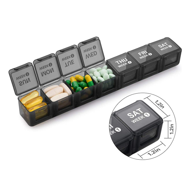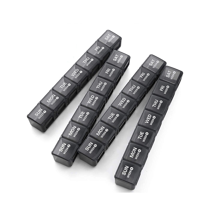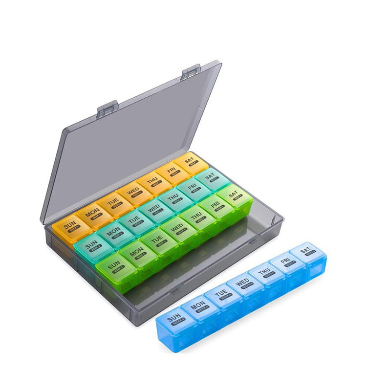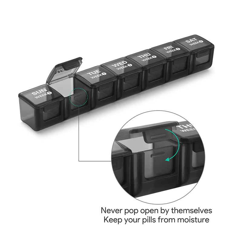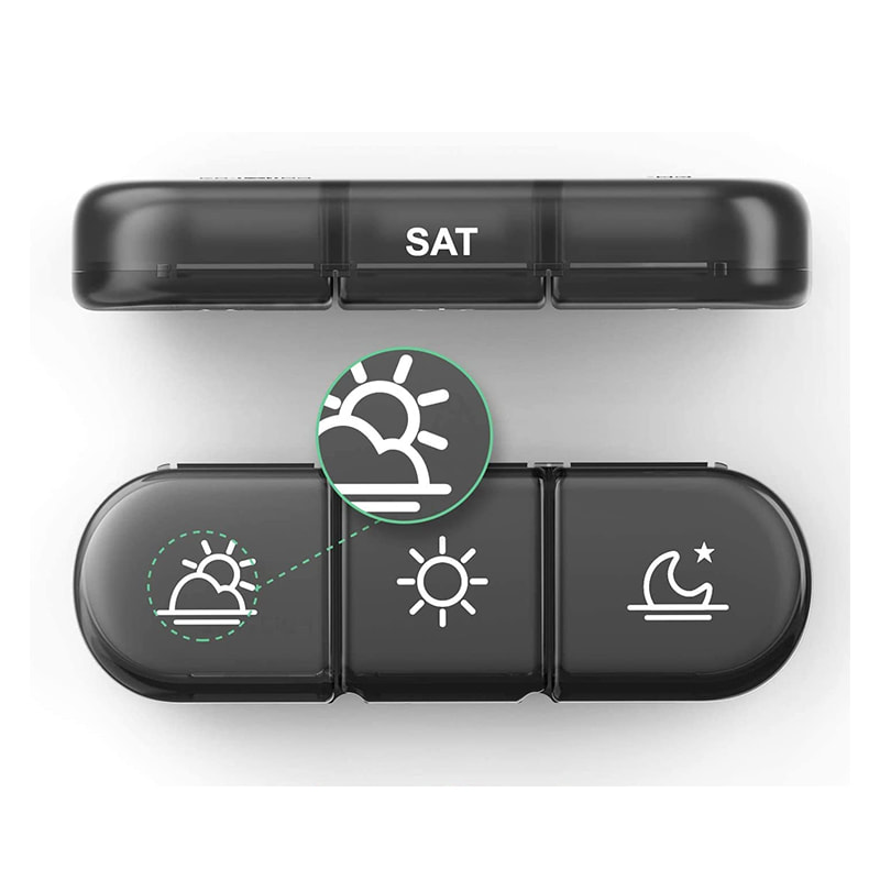 Daily pillboxes är gjorda av livsmedelsklassad PP-plast medan den yttre behållaren är gjord av ABS-plast, BPA-fri och säker för medicinsk användning.