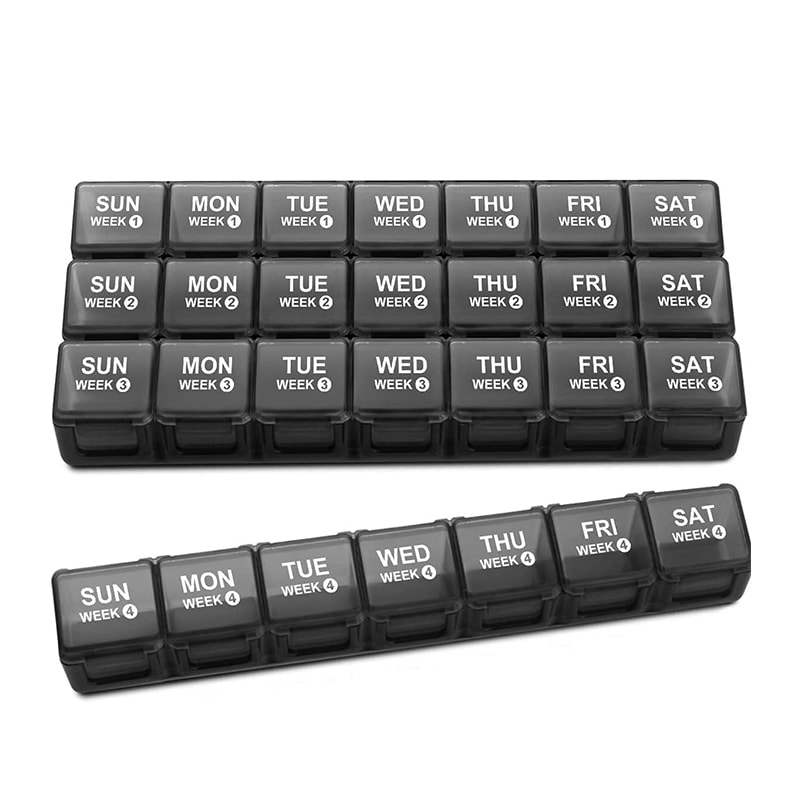 Vår pillerlåda har fyra en veckas pillerbehållare, kan hålla ordning på din en månads medicin och kommer att vara på rätt spår för att upprätthålla din AM/PM-medicinering.