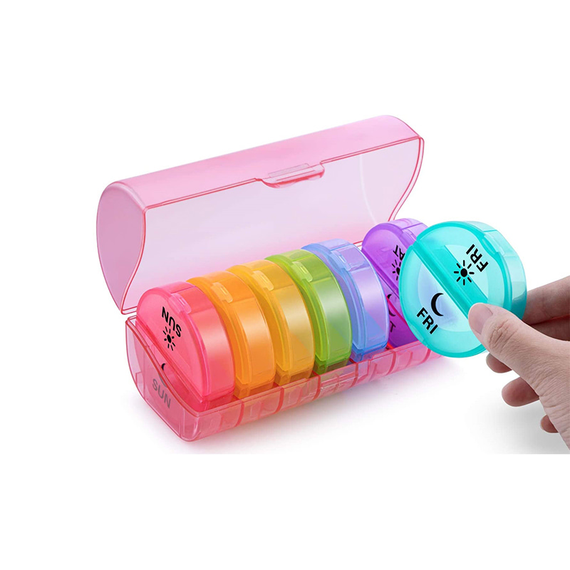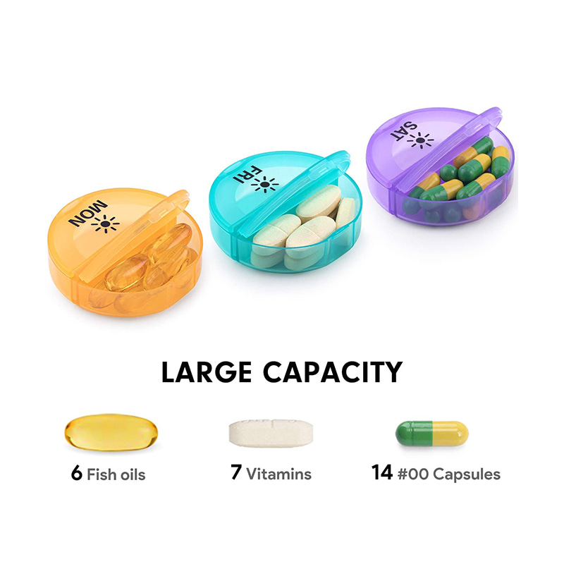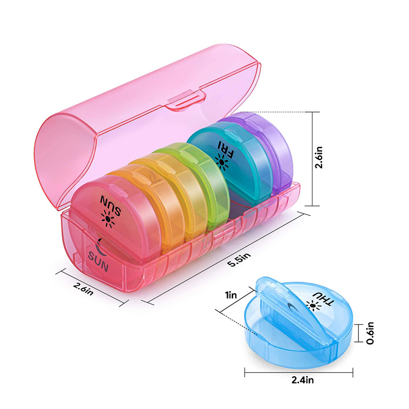 7 individuella dagliga lådor med 7 färger gör att du kan glida ut enstaka eller några dagars medicin att ta när du är ute.