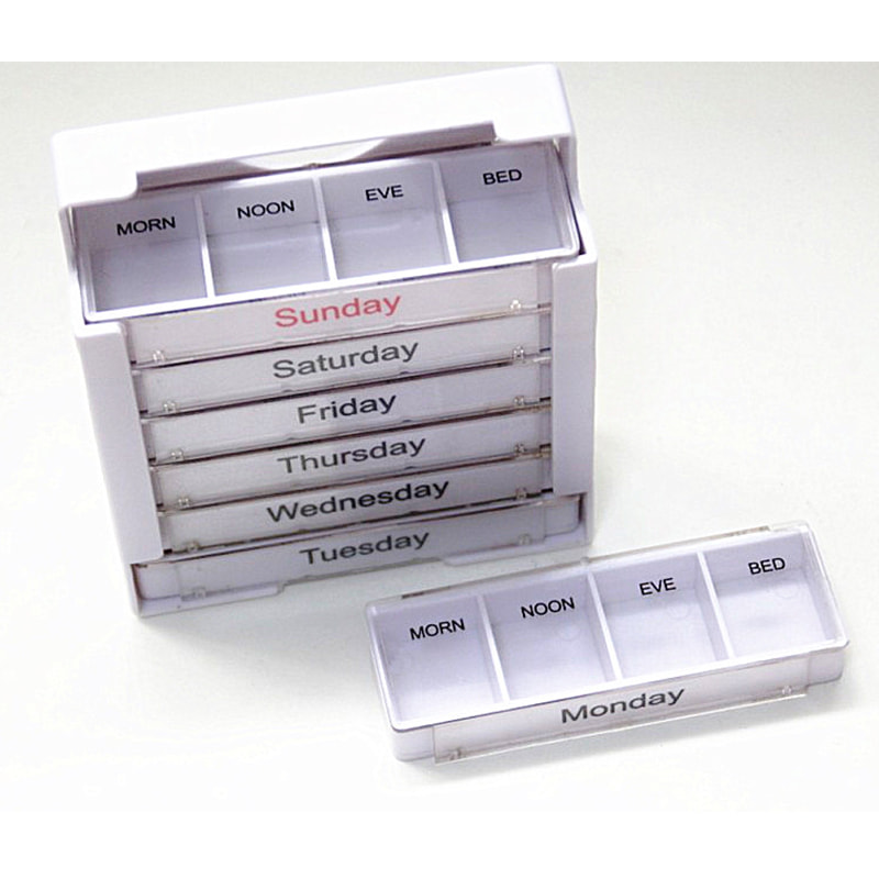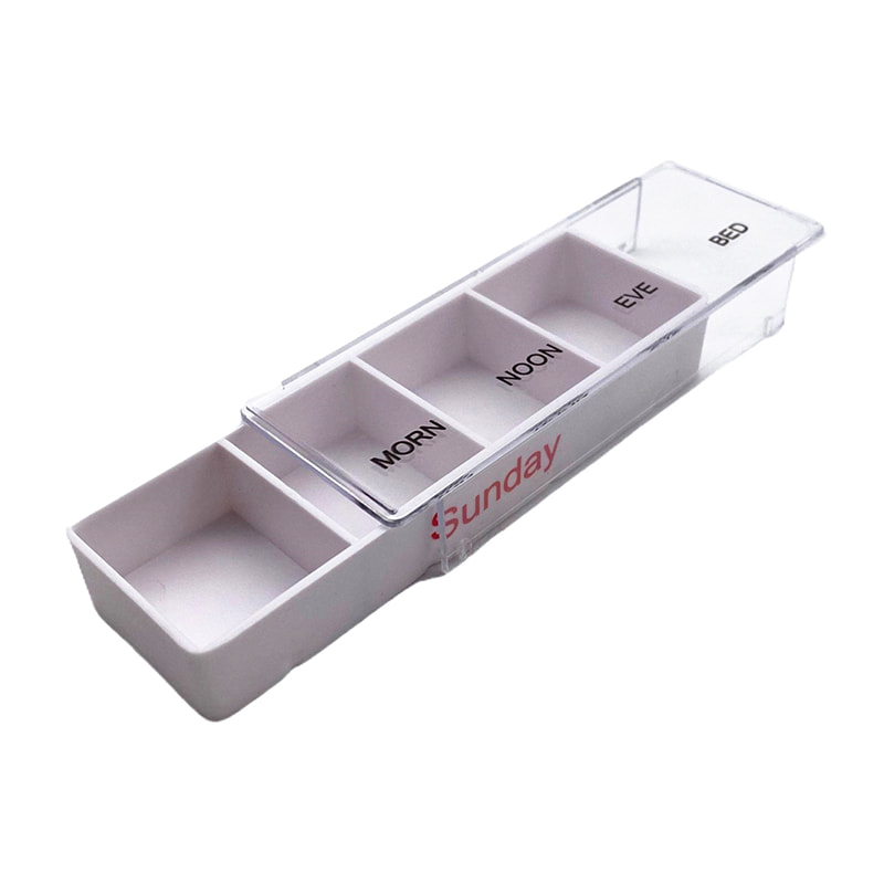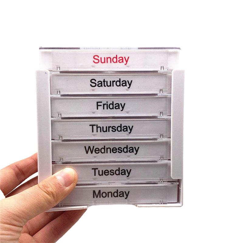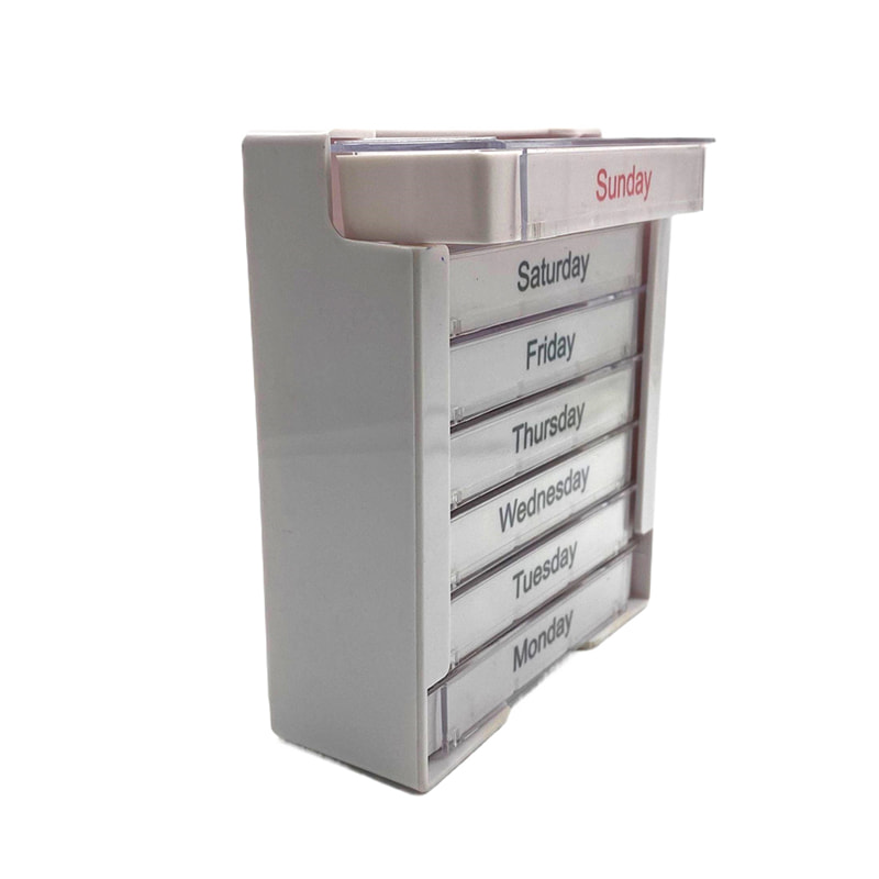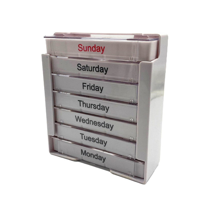 Ytterfodralet är designat genomskinligt och varje bricka har en unik ljus färg för användaren att enkelt urskilja veckodagar.