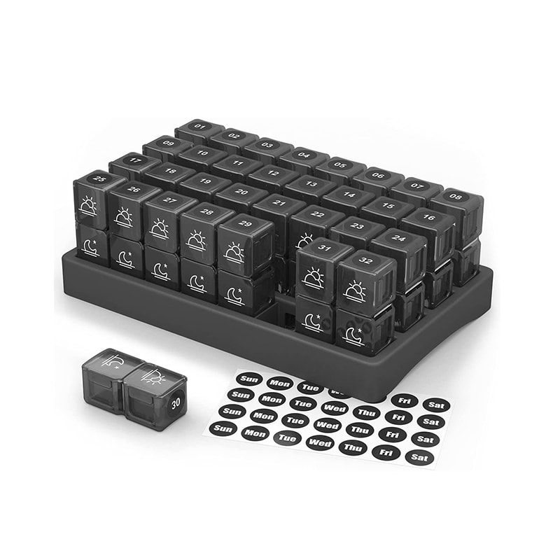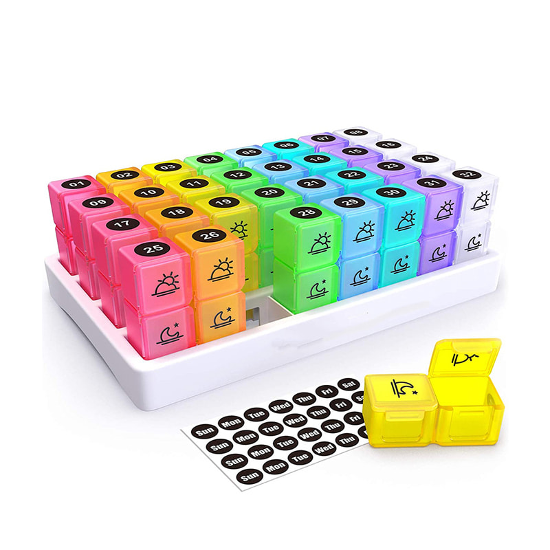 Vår 31-dagars månatliga pillerorganisatör har 32 numrerade ljusa och färgglada genomskinliga individuella pillerfodral som du kommer att kunna kontrollera för att se om du har tagit dina piller för dagen och på så sätt behöver du inte ha flera pilleraskar.