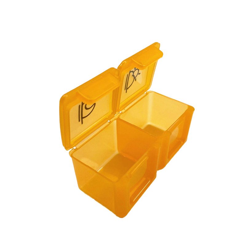Varje tablettbox har ett snäppstängt lock som låser säkert så att piller inte rinner ut.