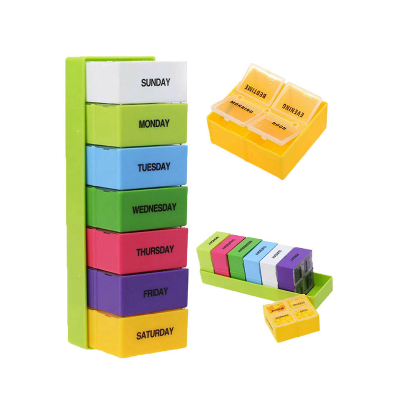Den har olika färger, tydligt märkta med veckodag och varje fack är över en tum djupt så det gör det enkelt att separera alla dina piller morgon, kväll och kväll.