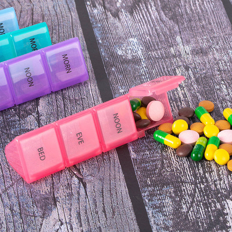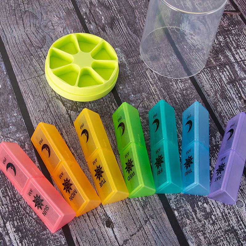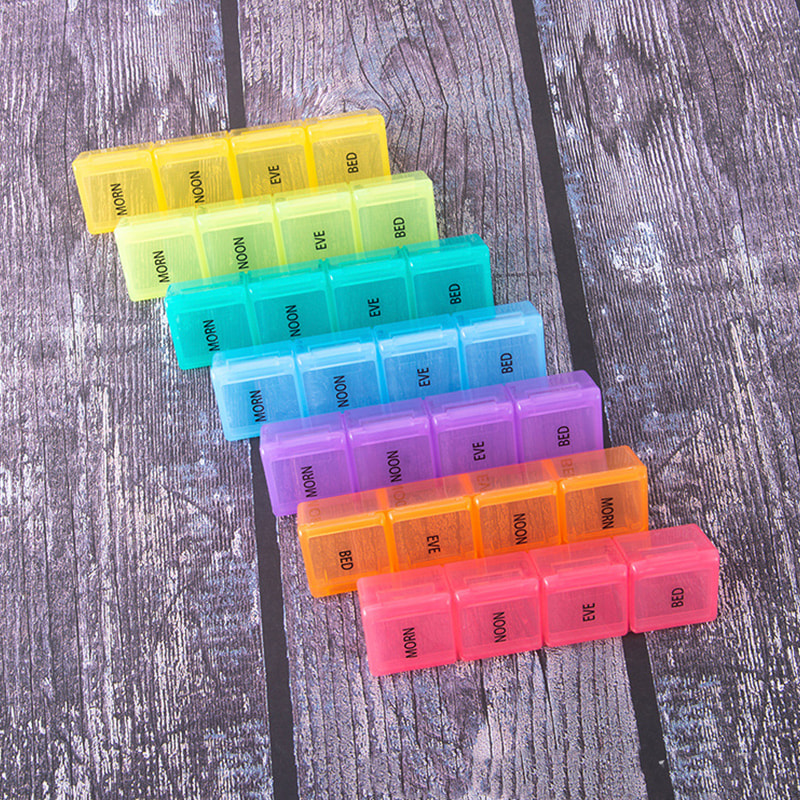 Varje bricka är indelad i 4 fack. Kompletteringsorganisatör med separata lock, pillerpåminnelse kan bäras med dig