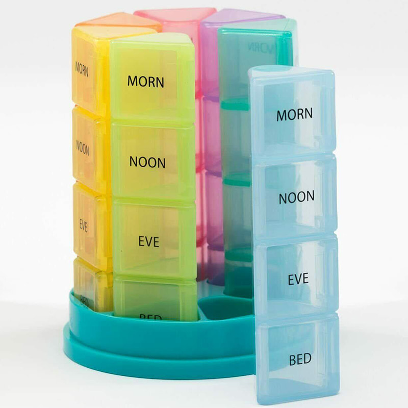 Varje kompakt medicinförpackning är tryckt med ikonerna för veckodatum och tid, och varje veckas tablettförpackning kan lätt särskiljas med 7 olika färger.