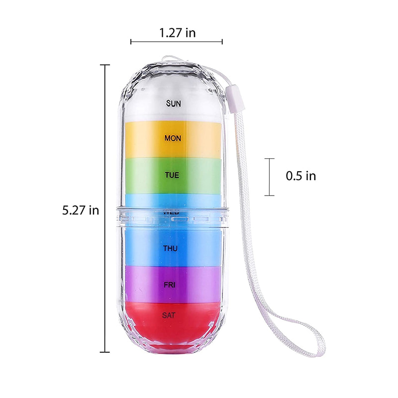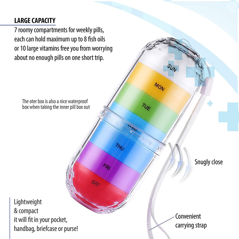 1 yttre behållare med rem och 7-dagars individuella fodral för att undvika oavsiktligt spill och hålla medicin säker, torr och borta från fukt. öppnas inte automatiskt när du trycker på den. Repet som är fäst i satsen gör den lätt att bära.