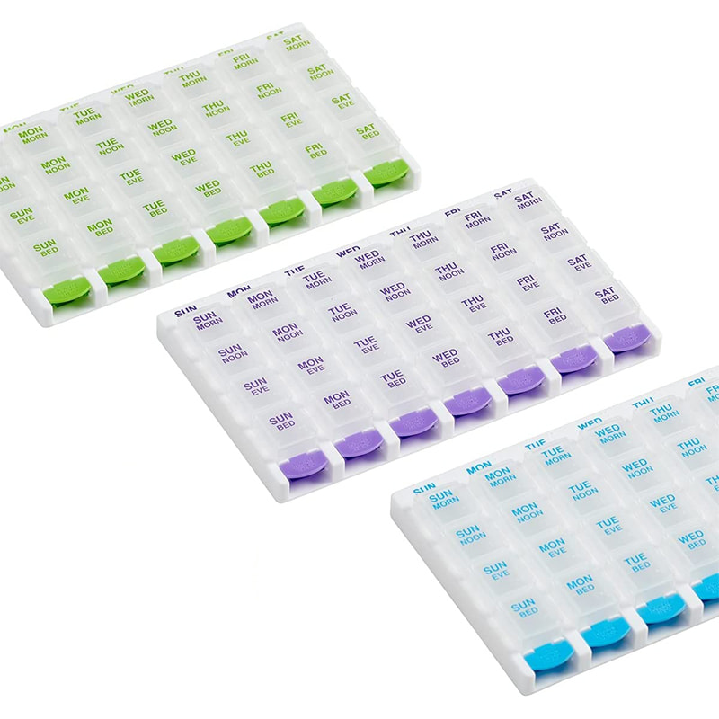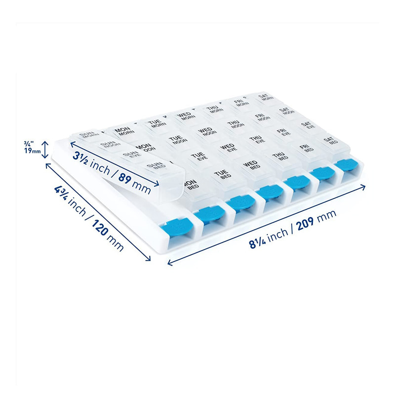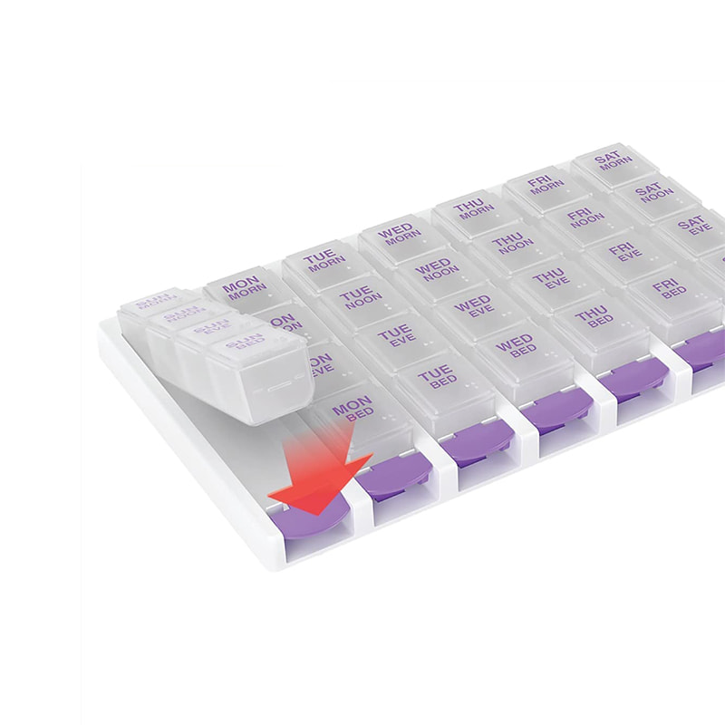 LÄTT ANVÄNDNING: Tryckknappar och rundade bottnar, gör pillerorganisatorn lätt att öppna och medicinen lätt att hämta