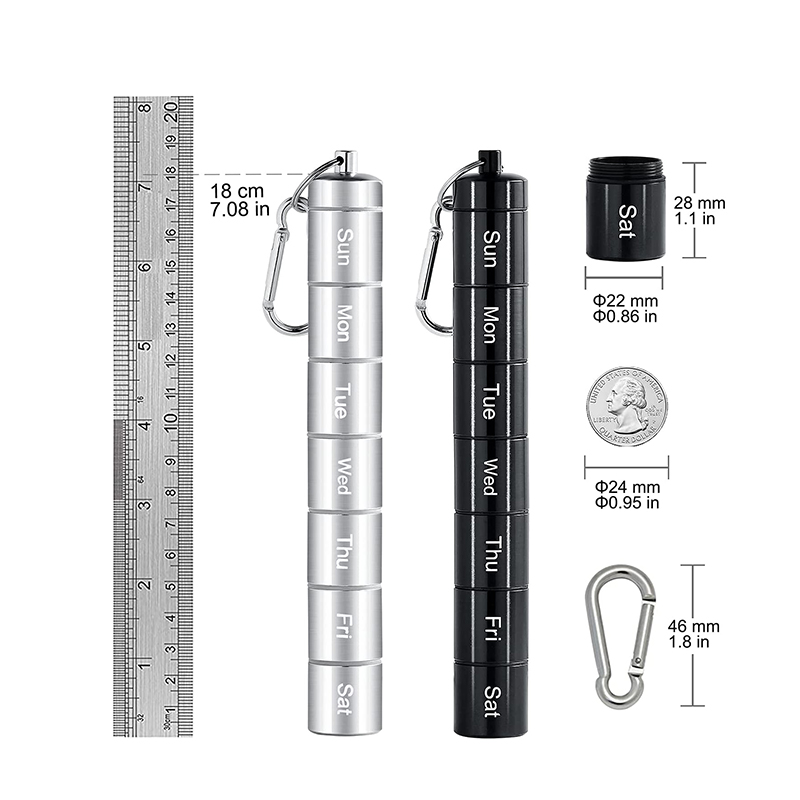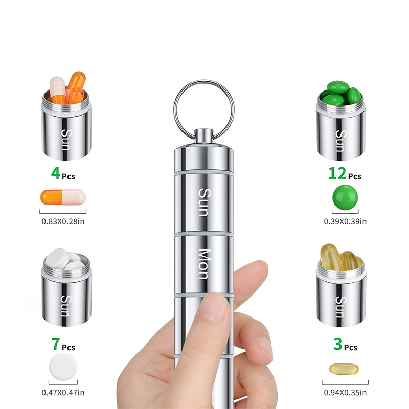 Varje veckas pillerfodral har en nyckelring och bergsklättringsspänne så att de kan hängas på nyckelringen eller väskan, lätt att bära, med silikontätningsringdesign, de är fuktbeständiga och vattentäta