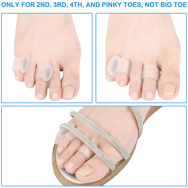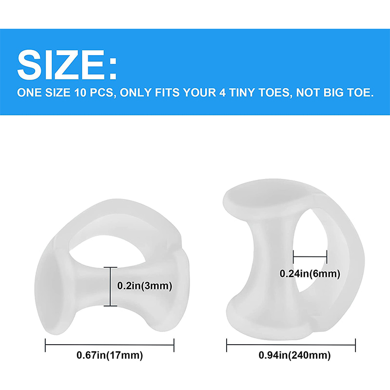 Små tåseparatorer hjälper till att frigöra dina tår från varandra, minskar gnidning och avlastar tryck, förhindrar överlappande tå, blåsor och sekundär skada på majs och hudinfektioner.